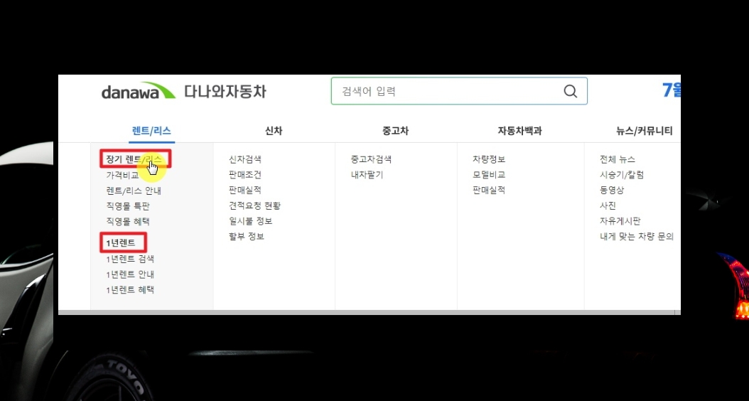 3. 다나와 자동차 사이트에 접속하면 메뉴에서 [장기 렌트 / 리스]를 클릭해 주세요. 1년 정도의 기간 동안만 차량을 이용하고 싶은 경우라면 [1년 렌트]를 선택하면 됩니다.