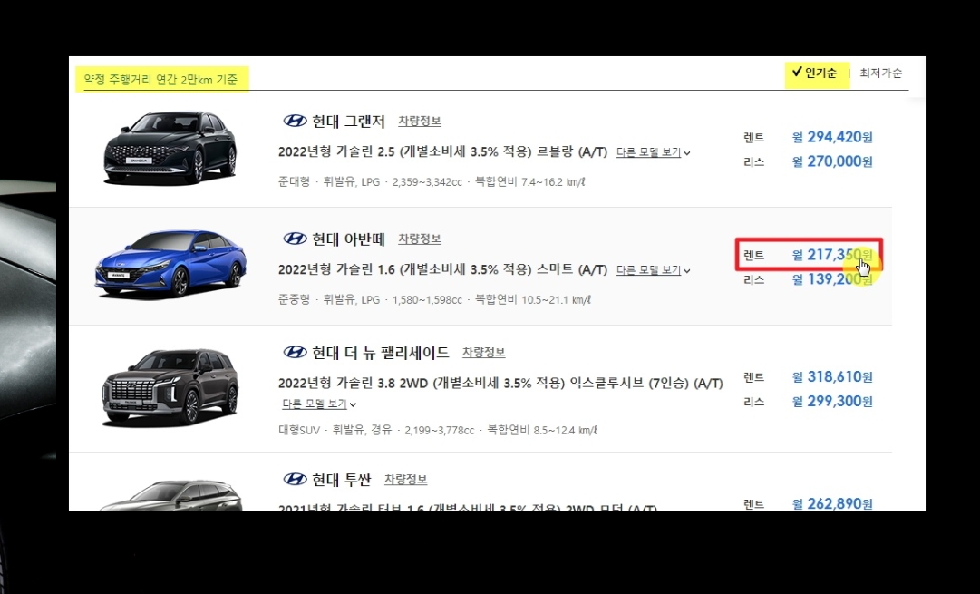 5. 제가 선택한 조건에 맞는 장기렌트 상품이 여러 개 나왔습니다. 약정 주행거리 연간 2만km 기준이 적용된 가격표가 나와 있는데요. 고급 모델일수록 월 요금이 비싸다는 것을 알 수 있습니다. 여기에서 마음에 드는 모델을 클릭해 보세요.