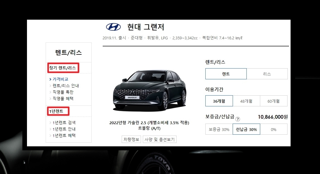 4. 새롭게 열린 페이지에서는 몇 가지 선택을 하도록 되어 있는 화면이 나타나는데요. 여기에서 장기간 이용하고 싶은 자동차 모델에 관한 몇 가지 정보를 선택하면 됩니다. 본인이 마음에 드는 차량 브랜드, 차종, 이용기간, 보증금 및 선납금 여부를 선택해 주세요.