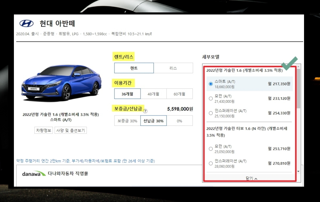6. 저는 현대자동차의 아반떼를 선택했습니다. 아무래도 저렴한 모델이기 때문에 월마다 발생하는 비용이 적은 편입니다. 화면에 나타나 있는 이용기간이나 선납금 여부, 세부모델을 클릭해 보세요. 바로 계산이 되어 장기렌트 상품을 이용할 때 납부해야 하는 월 비용이 표시됩니다.