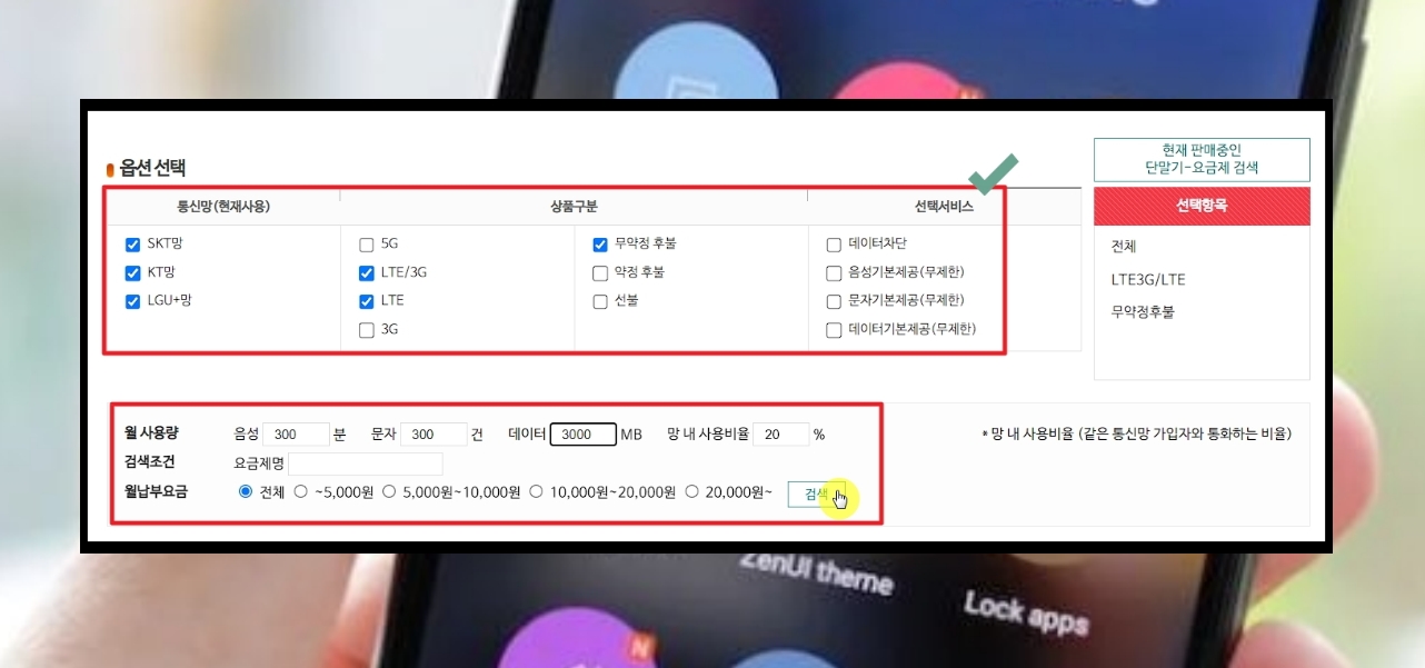 5. 마음에 드는 알뜰폰 서비스를 찾기 위해서는 옵션이나 조건을 지정하여 검색을 하면 됩니다. [옵션 선택] 카테고리에서 본인이 평소에 사용하는 패턴에 맞게 조건을 지정해 보세요.