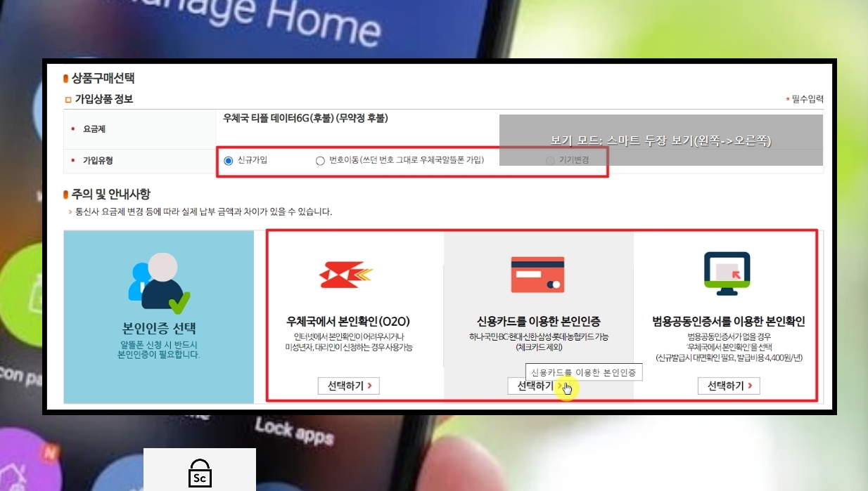 8. 앞서 언급한 바와 같이 온라인으로 알뜰 요금제를 가입하는 경우에는 본인 인증이 필요하다고 말씀드렸습니다. 상세 페이지에서 화면을 조금 내려보면 "주의 및 안내사항" 부분에 본인 인증을 하는 단계가 나옵니다. 여기에서 자신이 사용할 수 있는 인증 방법을 선택하여 가입을 진행하면 됩니다. 신규는 물론이고 번호이동이나 기기변경 방식으로도 진행할 수 있습니다.
