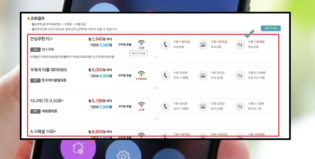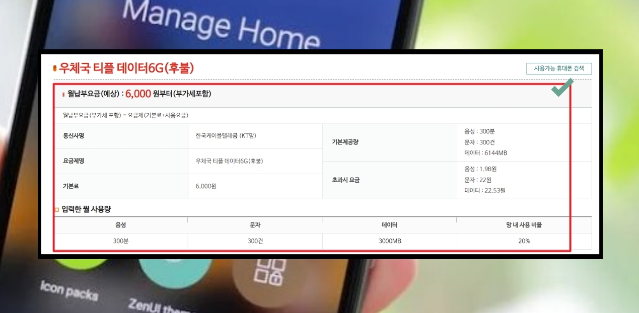 6. 음성 통화 100분, 문자 300건, 데이터 3기가를 월마다 이용하는 조건으로 알뜰 요금제를 검색해 보았습니다. 해당 조건을 충족하는 요금제가 여러 개 나왔는데요. 리스트를 낮은 가격 순으로 정렬을 하면 가성비 좋은 것을 먼저 살펴볼 수 있습니다. 이중에서는 데이터 6기가를 제공하는는 "우체국 티플 데이터 6기가"가 가장 마음에 드네요.