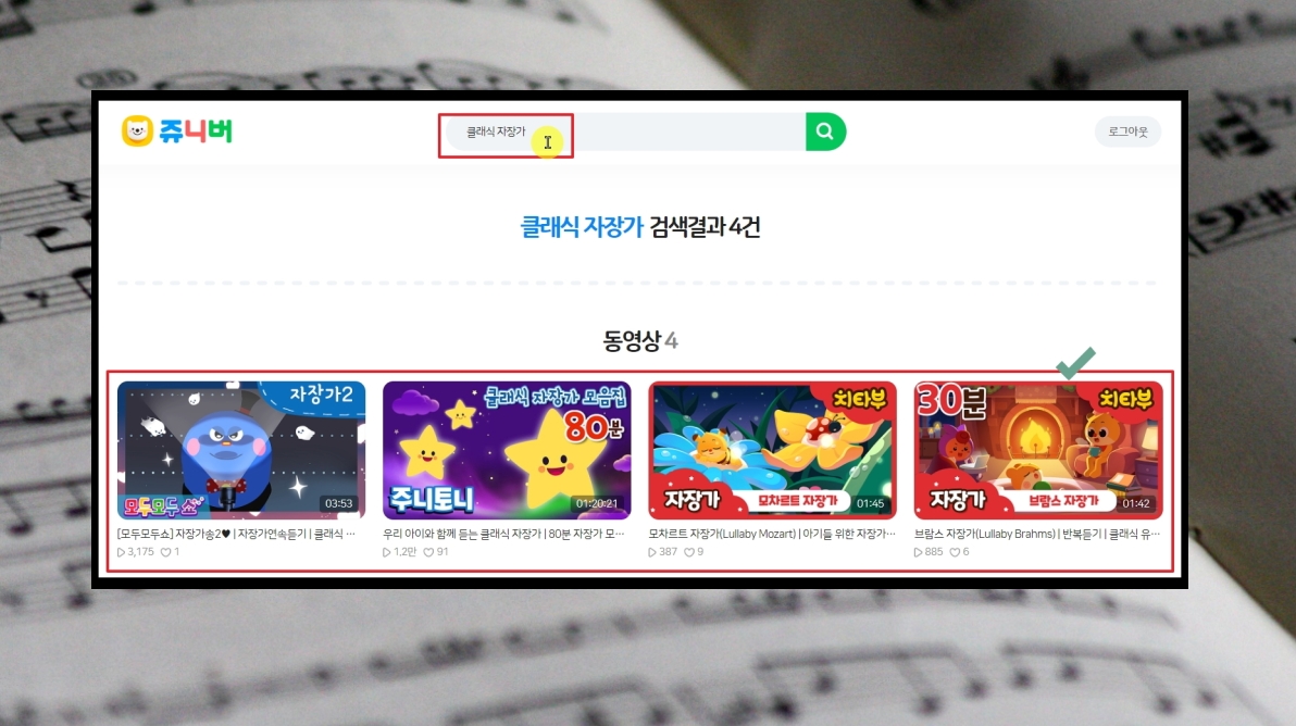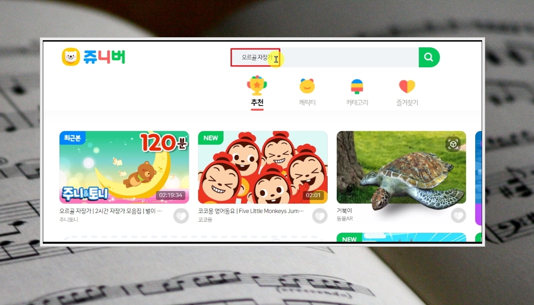 2. 아이들을 위한 웹사이트가 있습니다. 바로 쥬니버 입니다. 이곳을 통해 무료로 자장가 오르골 연속 듣기 할 수 있는데, 굉장히 쉽게 이용이 가능합니다.