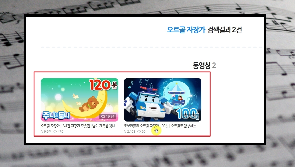 4. 검색 결과가 2개 나왔습니다. 2가지 모두 오랜 시간 연속으로 듣기 가능한 모음집으로 되어 있습니다. 각각 120분, 100분으로 구성이 되어 있죠. 아이가 로보카폴리를 좋아한다면 두 번째 컨텐츠를 이용하면 되고, 그렇지 않다면 첫 번째 것을 추천합니다. 그 이유는 첫 번째 컨텐츠의 이용 횟수가 월등히 많기 때문입니다.