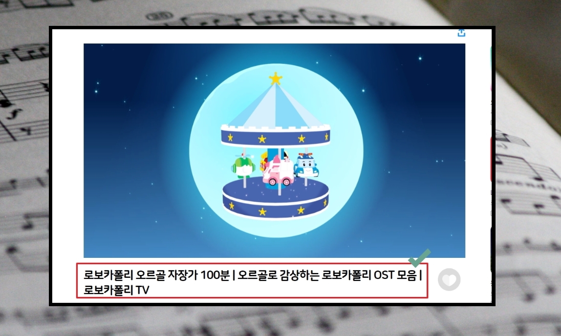 5. 이번에는 로보카폴리 오르골 자장가 100분을 선택해 보았습니다. 아름다운 영상과 함께 로보카폴리 OST로 구성된 곡을 들을 수 있습니다.