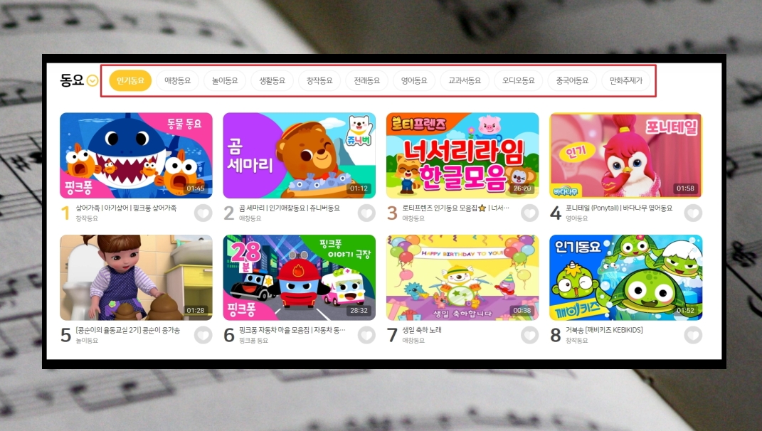 8. 최근 인기 있는 동요를 살펴보았습니다. 아이들이 좋아하는 상어가족, 곰 세마리, 거북송, 생일 축하 노래 등 다양합니다.