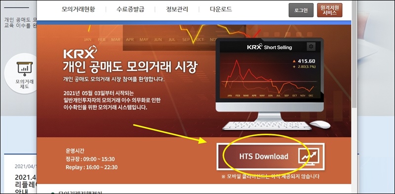 7. 개인 공매도 모의투자를 진행할 수 있는 HTS를 다운로드 받아 설치해 주세요. 2가지 방식으로 모의로 투자를 해볼 수 있는데요. 정규장과 리플레이 방식이 있어요.