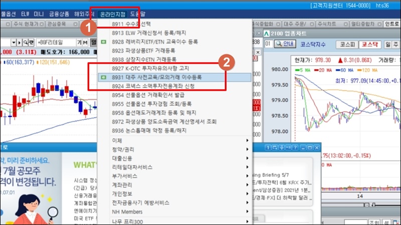 9. 이번에는 사용하고 있는 증권사의 HTS나 MTS를 실행해 주세요. 온라인으로 개인 공매도 사전의무 교육 및 모의투자에 대한 이수번호를 등록해야 하거든요. 메뉴에서 온라인 지점을 클릭한 후 "대주 사전교육 및 모의거래 이수등록" 메뉴를 선택해 주세요.