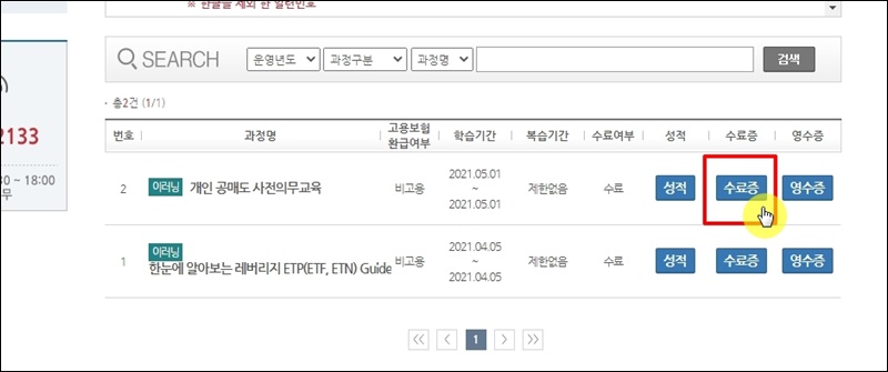 3. 수강을 하고 나면 이렇게 수료증을 확인할 수 있는 버튼이 활성화 되는데요. 해당 버튼을 클릭해서 이수 번호를 확인해야 해요. 해당 번호를 가지고 HTS나 MTS에 개인 공매도 이수 등록을 해야 하거든요.