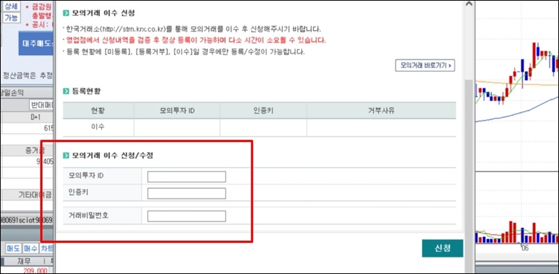 12. 모의거래 이수신청 및 수정 방법도 똑같아요. ID, 인증키, 거래비밀번호를 정확하게 입력하면 돼요. 제가 직접 해본 결과, 신청은 시간이 한 시간 정도 걸리더라고요. 등록 방법에 문제가 있는 것은 아니오니 신청 후 조금 기다려주세요.