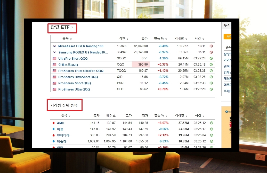 관련 ETF나 거래량 상위 종목 확인도 가능한데요. 투자를 하고 싶거나 좀 더 깊이 있게 흐름을 보고 싶을 때 참고하면 좋습니다.