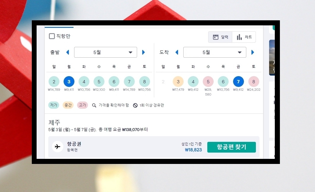 4. 검색 버튼을 누르면 이렇게 5월 달 중에서 김해 제주 티켓을 가장 저렴하게 구매할 수 있는 날짜를 찾을 수 있습니다. 각 날짜를 보면 색을 통해 얼마나 저렴한지 또는 비싼지 알 수 있습니다. 녹색은 저가, 주황색은 중간, 빨간색은 고가인데요. 마음에 드는 날짜를 클릭한 후 항공편 찾기 버튼을 누르면 됩니다.
