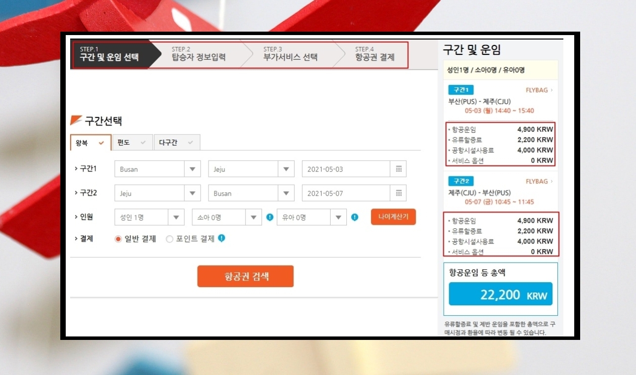 7. 선택 버튼을 눌러보세요. 부산 김해에서 제주에 갔다가 다시 돌아오는 특가 티켓을 예매할 수 있는 사이트로 이동하게 될 것입니다. 여기에서 구간 및 운임을 확인하고, 탑승자 정보 입력, 부가 서비스 선택, 결제까지 진행하면 예약을 마칠 수 있습니다.