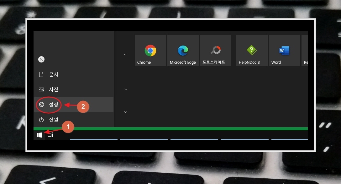 2. 다른 원인에 의해 노트북 키보드 입력 안될때 해결하는 방법을 알려드리겠습니다. 일단 키보드가 작동이 안되기 때문에 노트북을 제대로 사용할 수 없는 상태입니다. 이런 경우에는 마우스로 [시작]과 [설정] 버튼을 차례대로 클릭합니다.