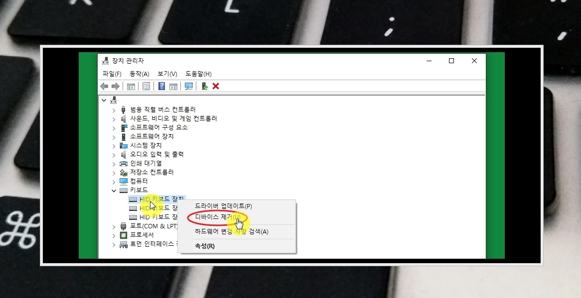7. 장치 관리자 목록에서 키보드 카테고리를 선택합니다. 그럼 현재 노트북에 연결된 장치가 여러 개 나타나는데요. 마우스 우클릭을 하면 나오는 메뉴에서 [디바이스 제거]를 클릭합니다. 이렇게 장치를 제거한 후 윈도우를 재시작 해보세요. 그럼 드라이버가 자동으로 설치되면서 자판 입력 문제를 해결할 수 있습니다.