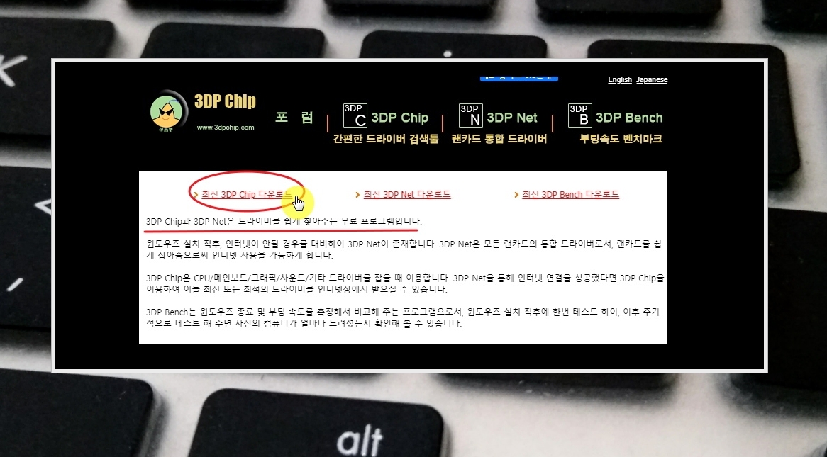 9. 해당 사이트에 무료로 제공하는 자동 드라이버 설치 프로그램을 이용하려고 합니다. 3dp chip 프로그래을 다운 받아 노트북에 설치해주세요. 안내에 나와 있듯이 해당 cpu, 메인보드, 그래픽카드, 사운드 카드, 기타 드라이버를 잡을 때 사용하는 프로그램입니다.