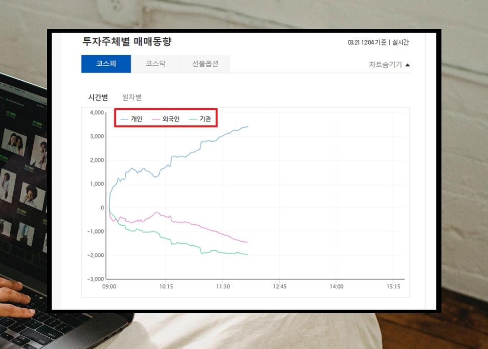 5. 홈페이지에서 시간별 그리고 일자별로 주식 시장 주체인 개인, 외국인, 기관의 매매 흐름을 파악할 수 있는 그래프가 나타납니다. 뉴스보다 이렇게 수치화 또는 그래프화 되어 있는 것이 더 의미있다고 생각합니다. 속임수가 좀 덜하기 때문입니다.