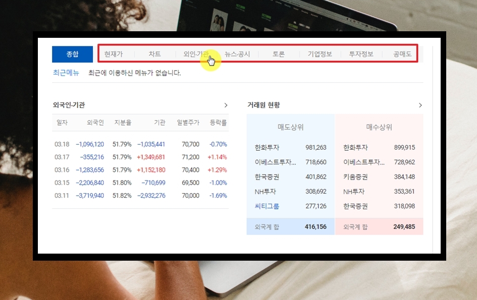 8. 기본적인 것 외에도 현재가, 외인 및 기관 투자 동향, 종목 관련 뉴스와 공시, 기업 등 해당 사이트를 통해 대부분의 정보 획득이 가능합니다.