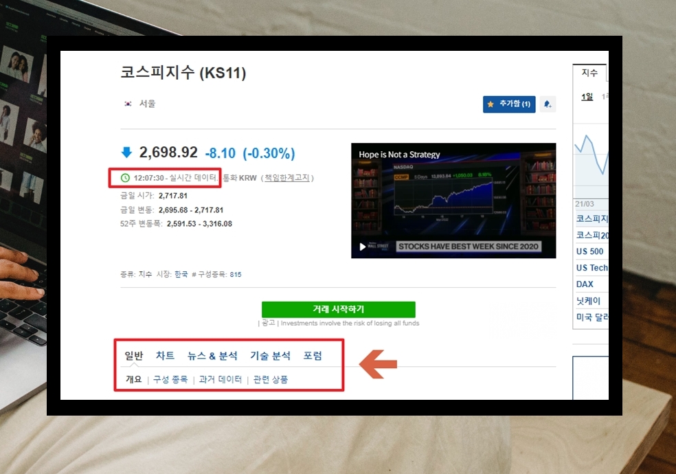 13. 저는 코스피 지수를 선택했습니다. 실시간으로 시세 확인이 가능하고, 이 외에 구성 종목, 관련 상품, 과거 데이터, 기술 분석, 차트, 포럼, 뉴스 등 다양한 서비스를 무료로 이용할 수 있습니다.