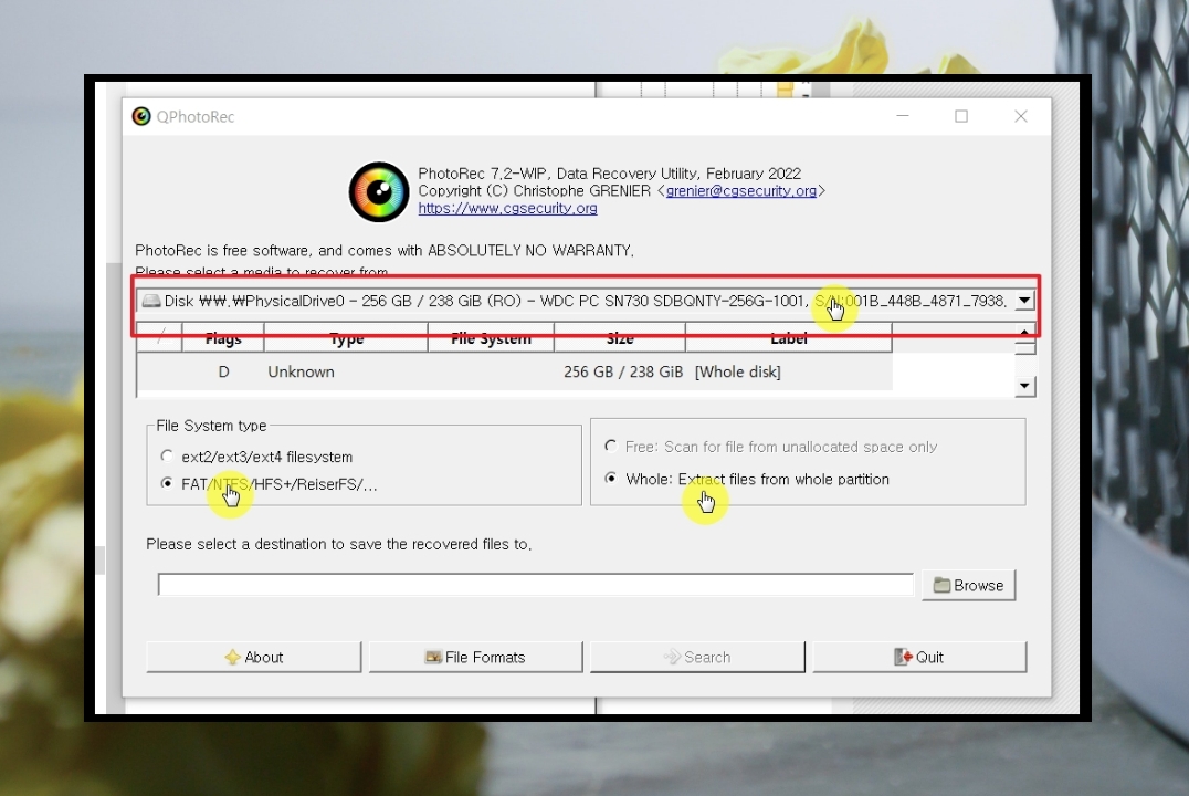 4. 프로그램이 실행 되었습니다. 본격적으로 PhotoRec을 이용한 휴지통 비우기 복구 방법을 진행해 보도록 하겠습니다. 가장 먼저 복구할 HDD 또는 SDD를 선택합니다. 그 다음 파일 시스템 타입을 지정합니다. 잘 모르면 Fat, NTFS가 있는 것을 선택하면 됩니다. 그 옆에 있는 선택 사항에는 Whole로 기본 지정이 되어 있습니다.