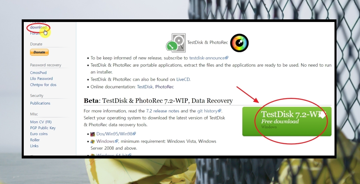 2. photorec 사이트에 접속하면 좌측에 다운로드 메뉴가 있습니다. 다운로드 페이지가 열리면 TestDisk 프로그램을 다운 받도록 하겠습니다. 사이트 이름에 Photo(사진)이 들어가 있다고 해서 휴지통에서 삭제한 사진이나 이미지만 복구 될 거라고 생각하실 수 있습니다. 전혀 그렇지 않고 모든 파일 포맷을 복구할 수 있습니다.