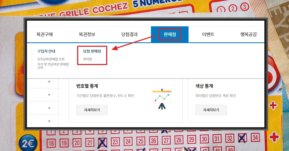 5. 꿈과 더불어 당첨 확률 높이는 데에 도움이 되는 방법을 알려드리겠습니다. 홈페이지 메뉴에서 [판매점]을 클릭해 봅니다. 그럼 구입처 안내와 판매점 메뉴를 찾을 수 있습니다. 여기서 당첨 판매점에 있는 [회차별]을 클릭합니다.