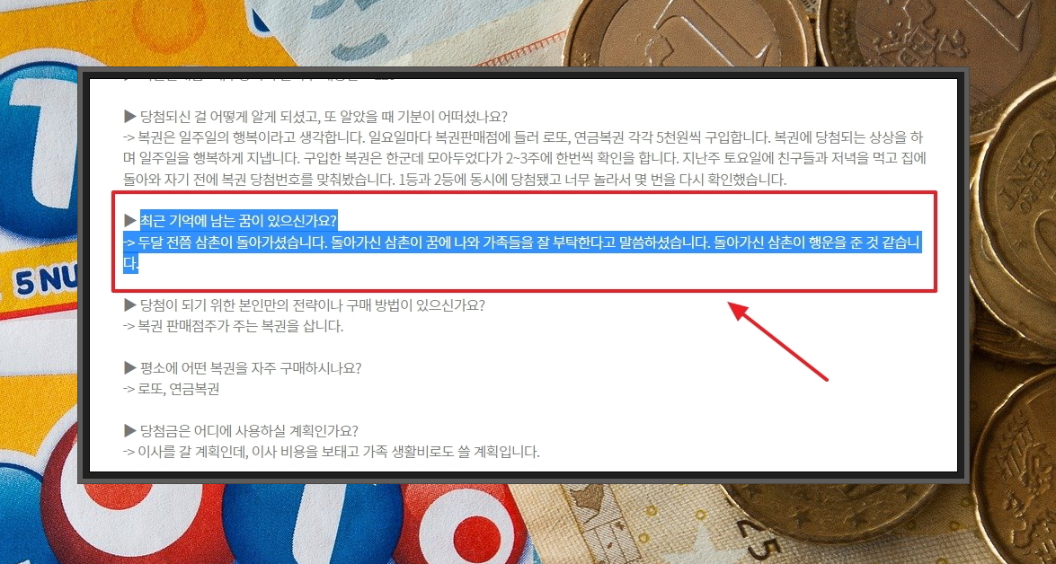 4. 인터뷰 내용을 하나 선택해서 살펴보겠습니다. 인터뷰 질문을 보면 최근에 기억에 남는 꿈이 있는지 묻고 있습니다. 이에 대한 답변을 확인할 수 있습니다. 이런 식으로 인터뷰를 통해 로또 관련 꿈에 대해 정확하게 살펴볼 수 있습니다.