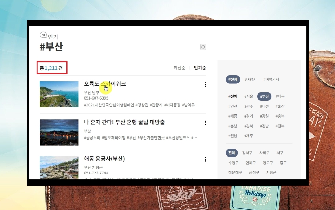 8. 저는 부산을 선택해 보았습니다. 이곳에서 추천하는 곳이 1,211개나 됩니다. 전국 방방곳곳을 다녀본다면 평생을 해도 못할 정도로 많은 여행지가 있다는 것을 알 수 있었습니다.