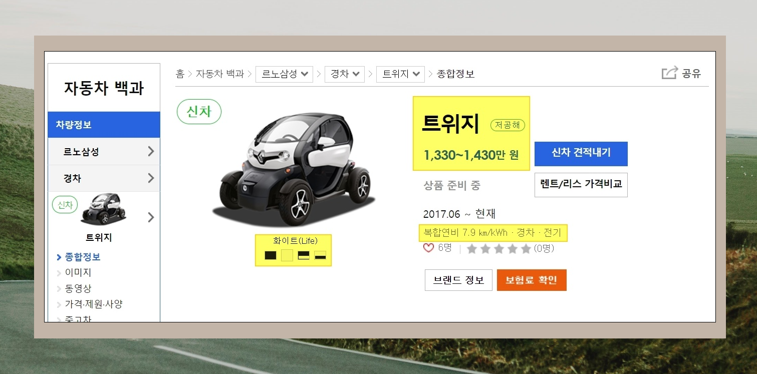 2. 좀 더 정확하게 르노 트위지 가격을 알아보겠습니다. 다나와 자동차 사이트를 이용하면 앞서 언급한 조건을 반영하여 해당 차량을 구입할 때 얼마의 비용이 드는지 최종적인 가격을 알 수 있습니다.