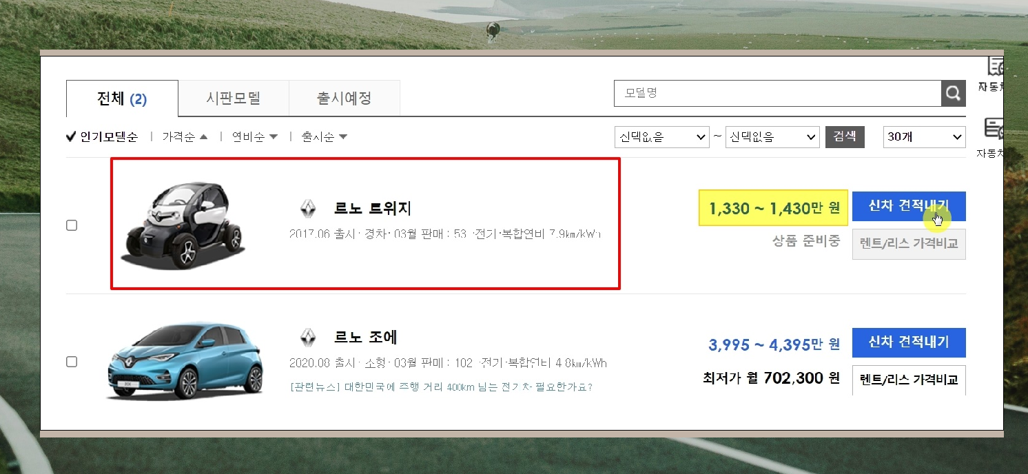 5. 저는 로느 경차와 소형을 선택했기 때문에 경차인 트위지와 소형차인 조에가 검색되었습니다. 가격을 보면 3배 정도 차이가 납니다. 여기서 "신차 견적내기" 버튼을 누르면 최종 가격을 확인할 수 있는 서비스를 사용할 수 있습니다.