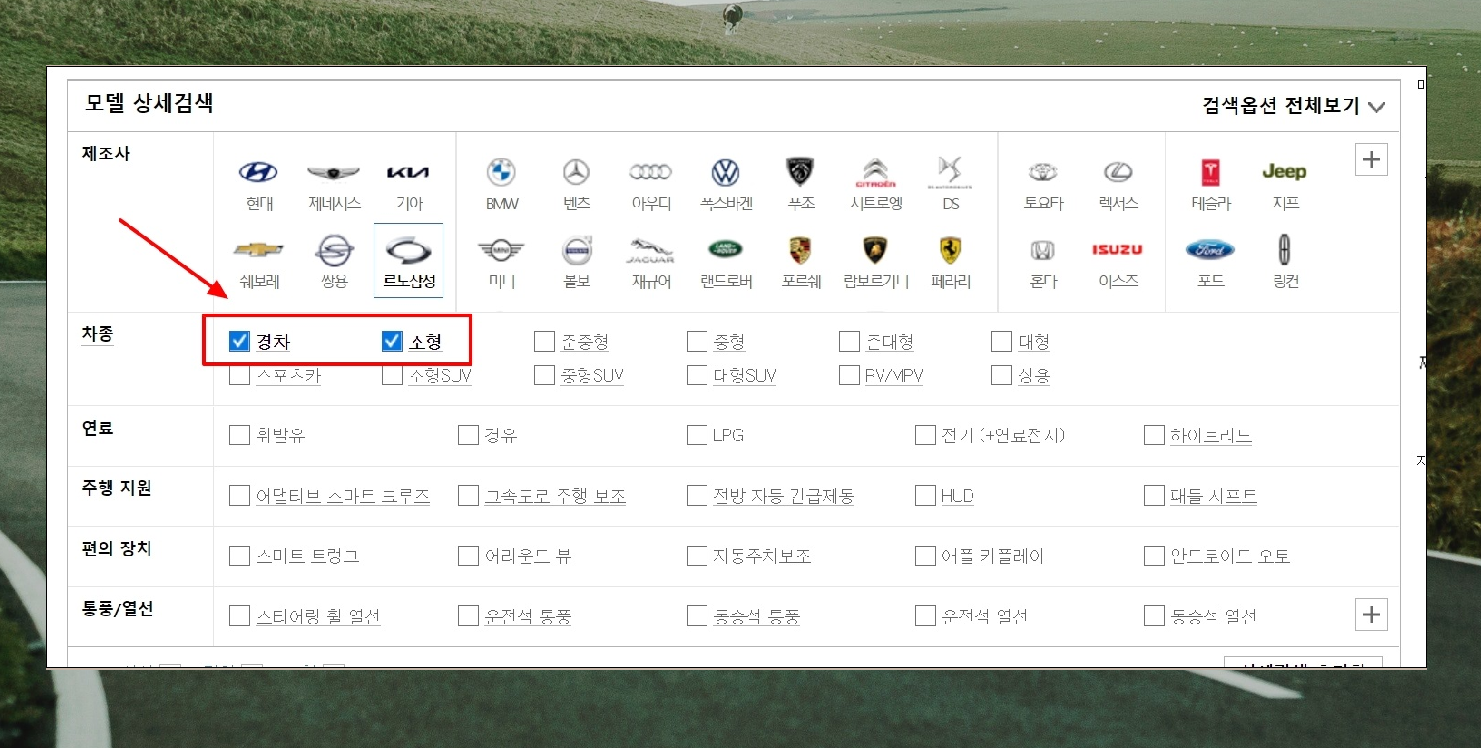 4. 모델 상세검색 페이지가 나타났습니다. 여기에서 원하는 조건을 고르면 선택한 조건에 맞는 차량 모델을 찾아주는데요. 트위지의 경우 차종에서 "경차"를 선택하면 됩니다. 연료 타입은 "전기"를 선택하면 되고요.