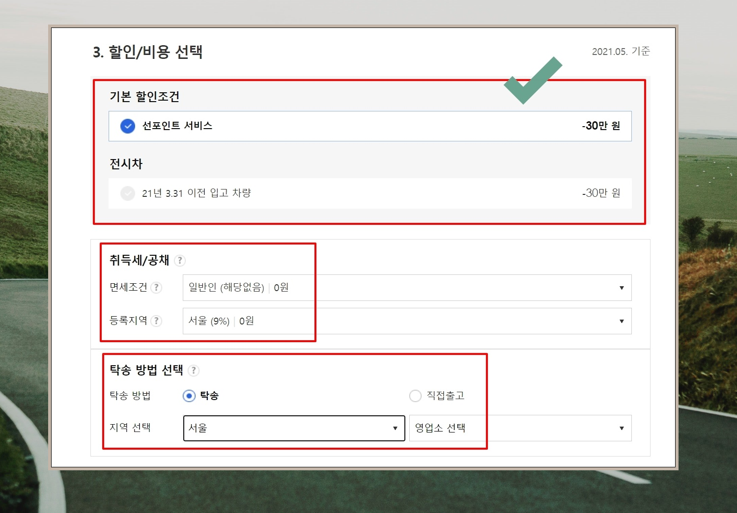 8. 마지막으로 르노 트위지 가격에 대하여 할인을 해주는 조건을 선택합니다. 선포인트 서비스 이용하거나 21년 3월 31일 이전에 입고한 차량을 구매하면 30만원 정도 할인이 가능합니다.