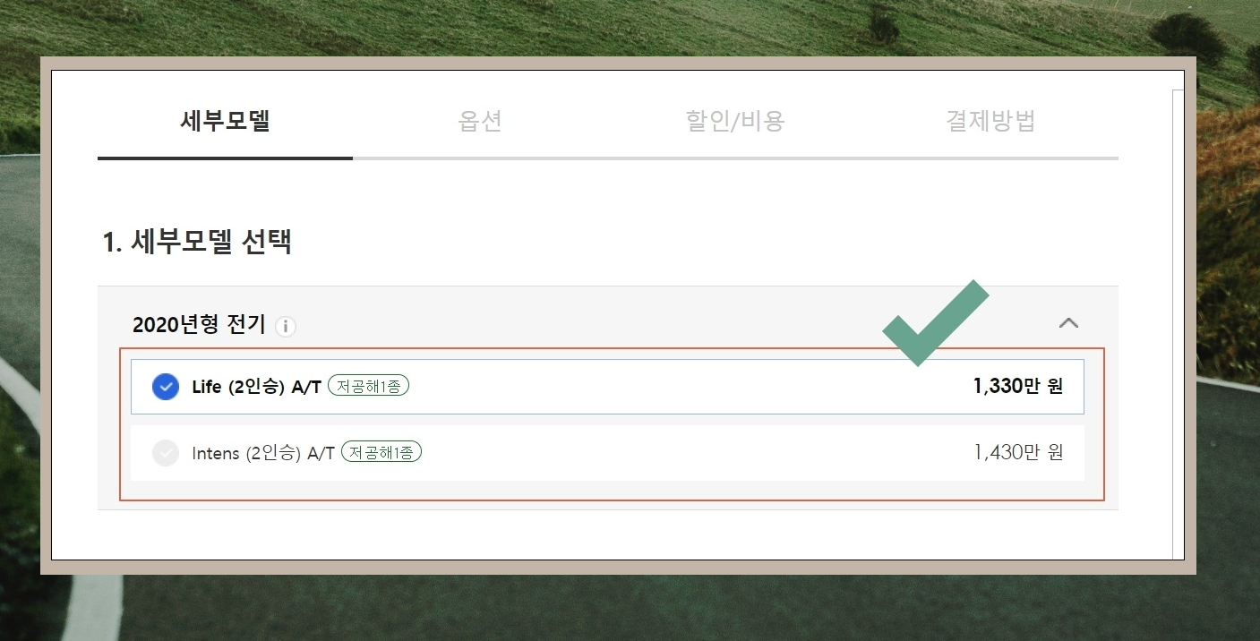 6. 가장 첫 번째로 선택해야 할 것은 세부모델입니다. 트위지의 경우 Life과 Intens 이렇게 2가지 세부모델 중 하나를 선택할 수 있습니다. 100만원 차이기 때문에 적어 보일 수 있으나 제 생각에는 저렴하게 구매해서 사용할 차량이기 때문에 기본 수준으로 사는 것이 낫다고 봅니다.