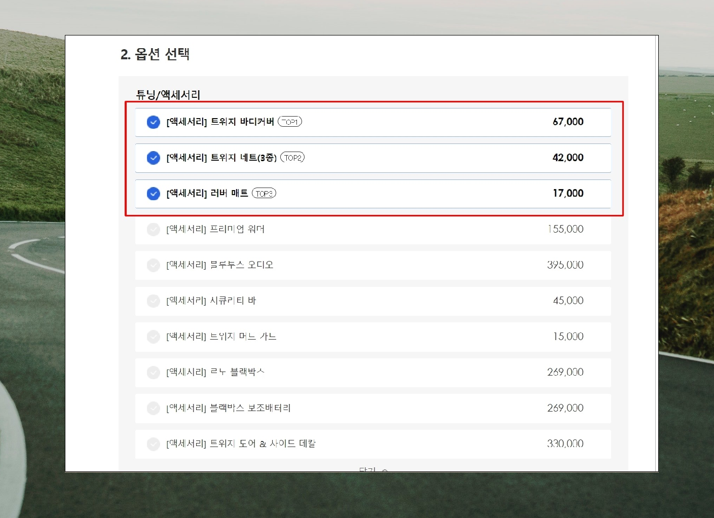 7. 이번에는 옵션을 선택할 차례인데요. 블루투스 오디오, 시큐리티 바, 트위지 머드 가드, 르노 블랙박스, 보조배터리 등 여러 가지가 있습니다. 리스트를 자세히 보면 TOP 표시가 되어 있습니다. 사람들이 선호하는 옵션을 의미하는 것인데요. 옵션 선택에 참고하면 좋습니다.