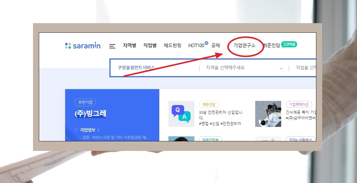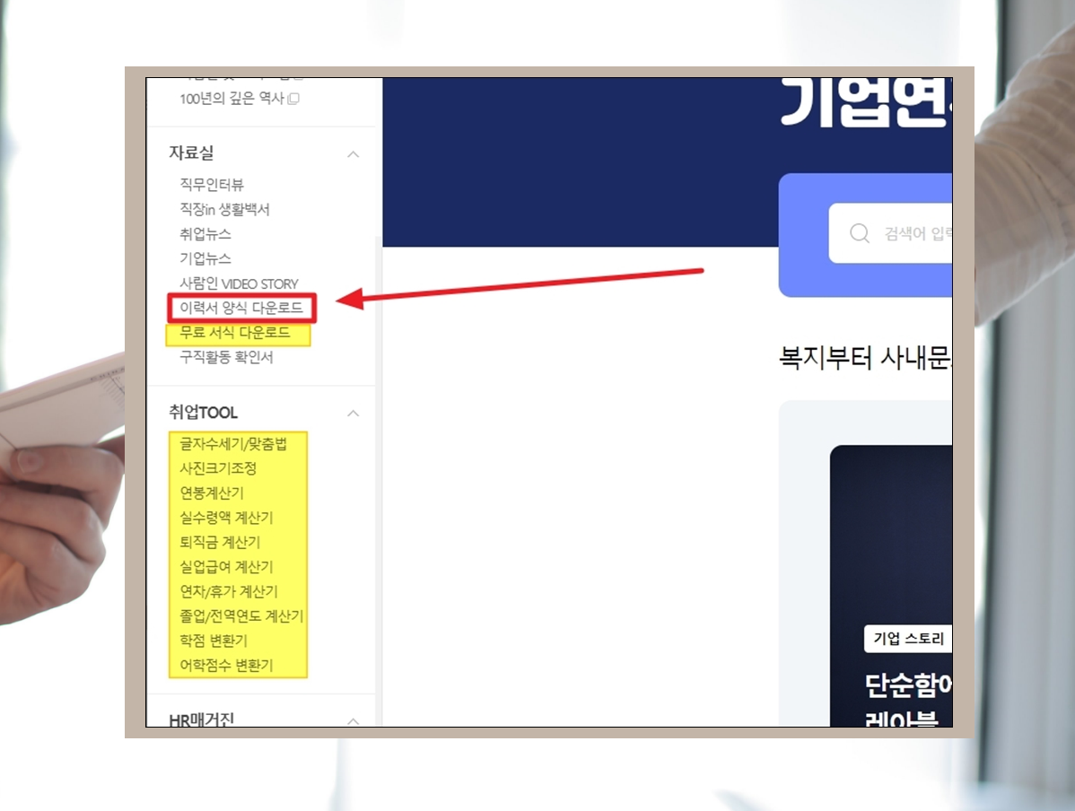 메뉴에서 "기업연구소"를 클릭해 주세요. 취업이나 직장 생활에 관련된 많은 자료를 얻을 수 있는 곳입니다.