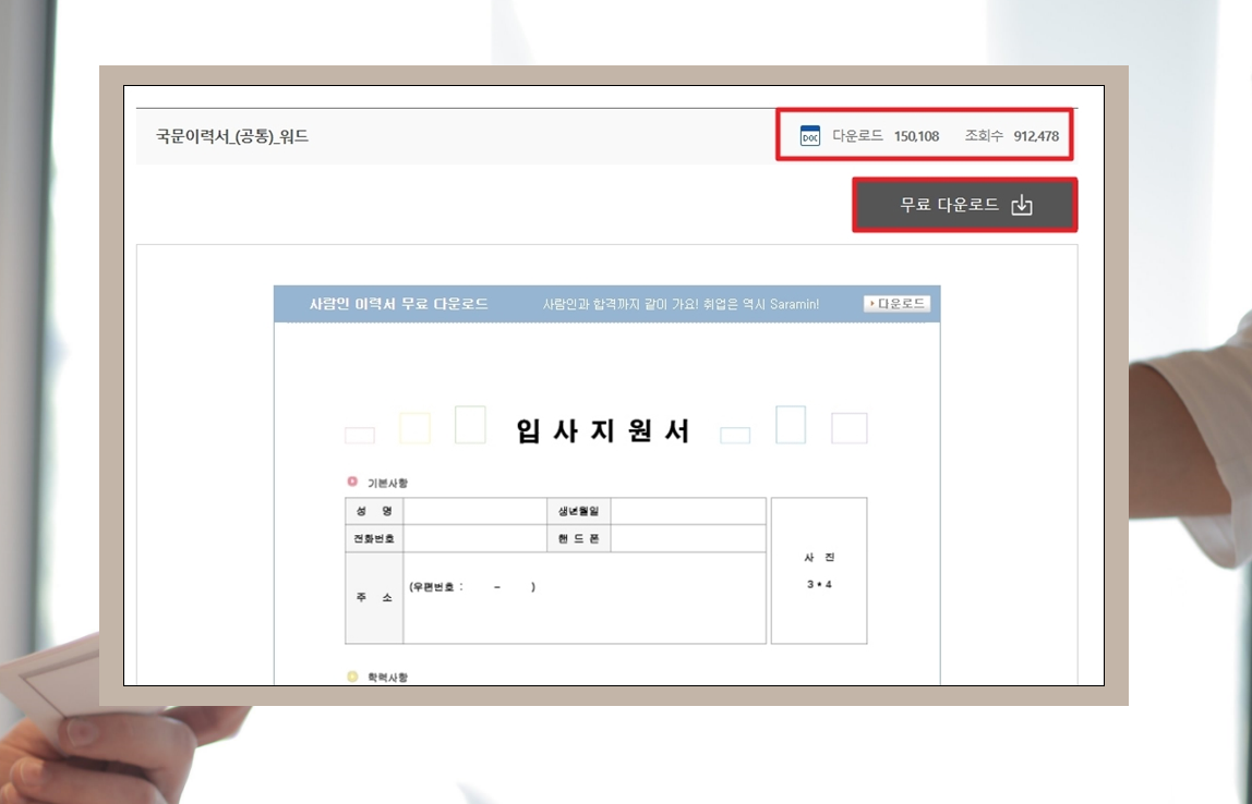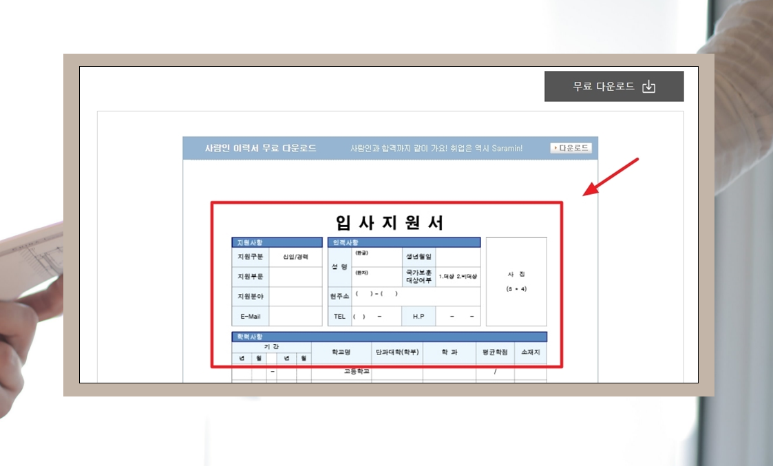 해당 양식은 "사람인"이라는 채용 사이트에서 다운 받을 수 있는데, 누구나 무료로 이용할 수 있도록 되어 있습니다.