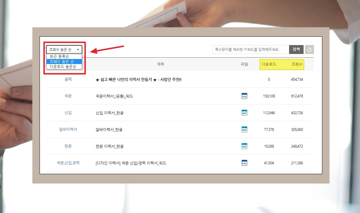 이러한 경우 정렬 기능을 사용하여 조회수가 높거나 다운로드 횟수가 높은 것을 찾아서 사용하는 방법이 있습니다.