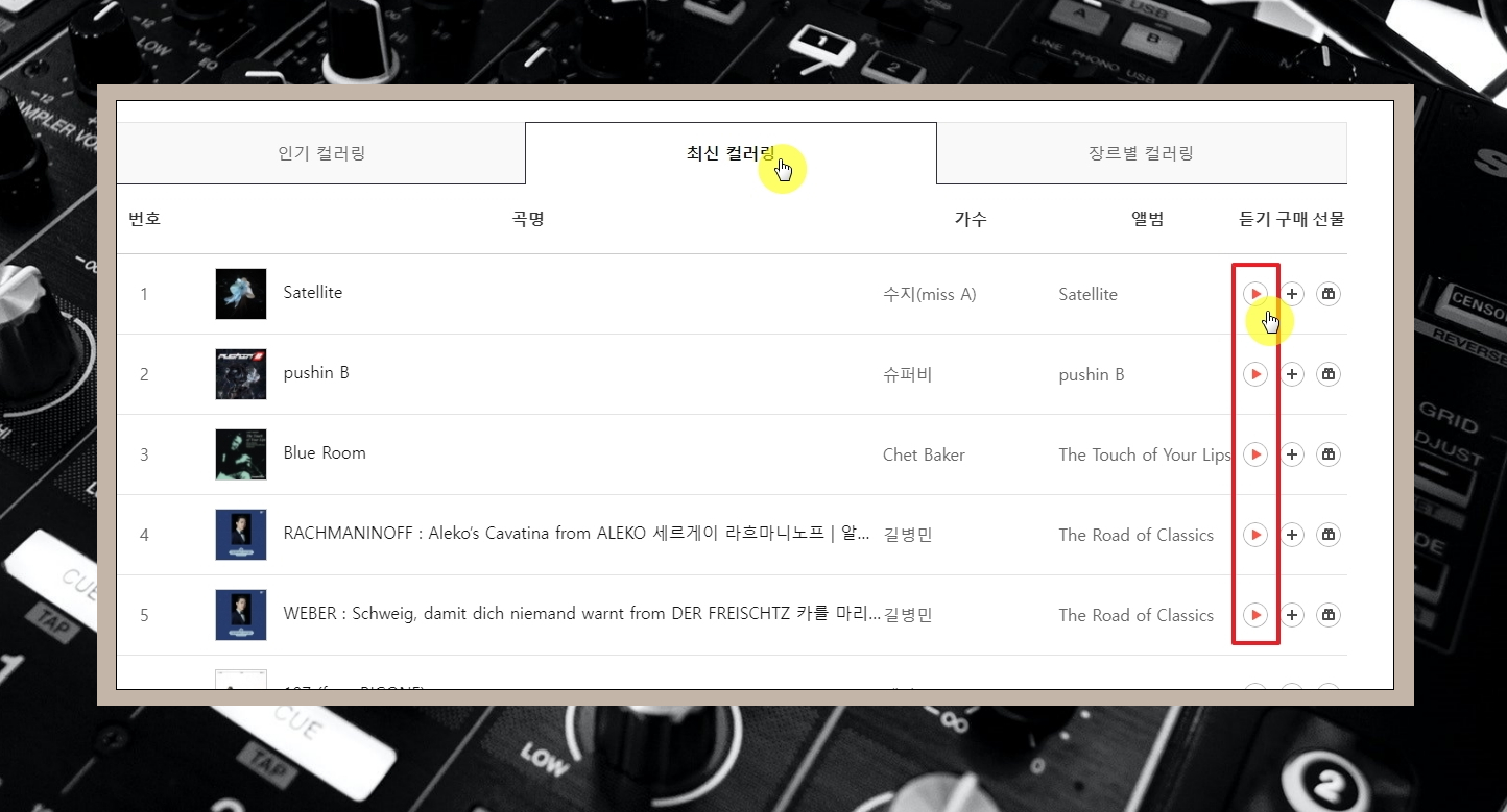 6. 그럼 본격적으로 이곳을 컬러링 다운받는곳으로 사용하는 방법을 알려드리겠습니다. 곡 리스트를 보면 맨 우측에 [듣기], [구매], [선물] 버튼이 있습니다. 여기에서 [듣기]에 위치한 [재생] 버튼을 클릭합니다.