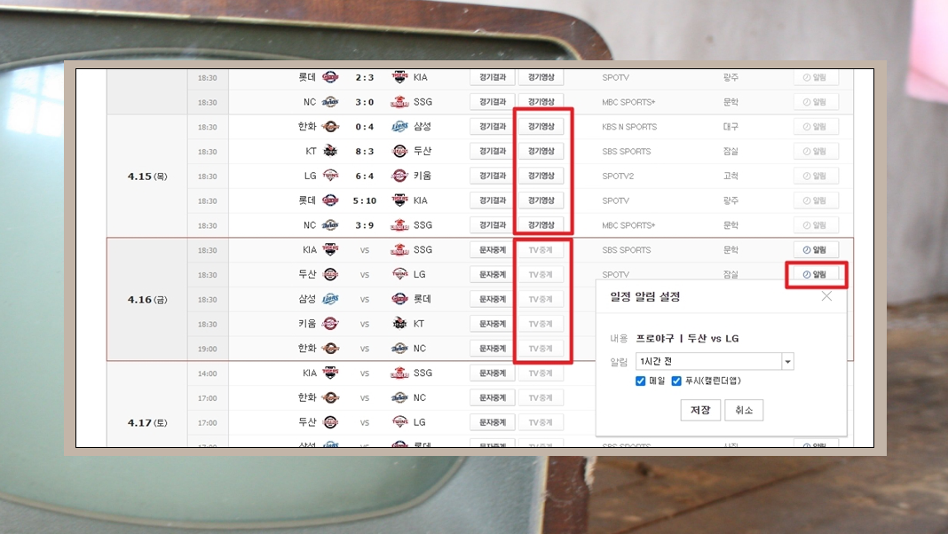 경기가 시작될 때 알림을 받고 싶은 경우 "일정 알림 설정" 기능을 활용해 보세요.