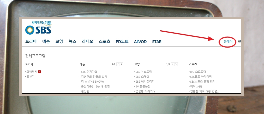 인터넷을 통해 SBS 공식 홈페이지에 접속하면 우측 상단에 있는 "온에어" 메뉴를 선택합니다.