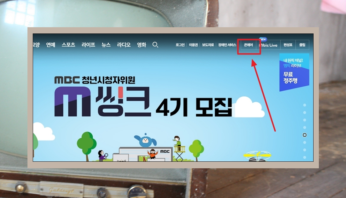 사이트에 접속하면 우측 상단에 있는 "온에어" 메뉴를 클릭해 주세요.