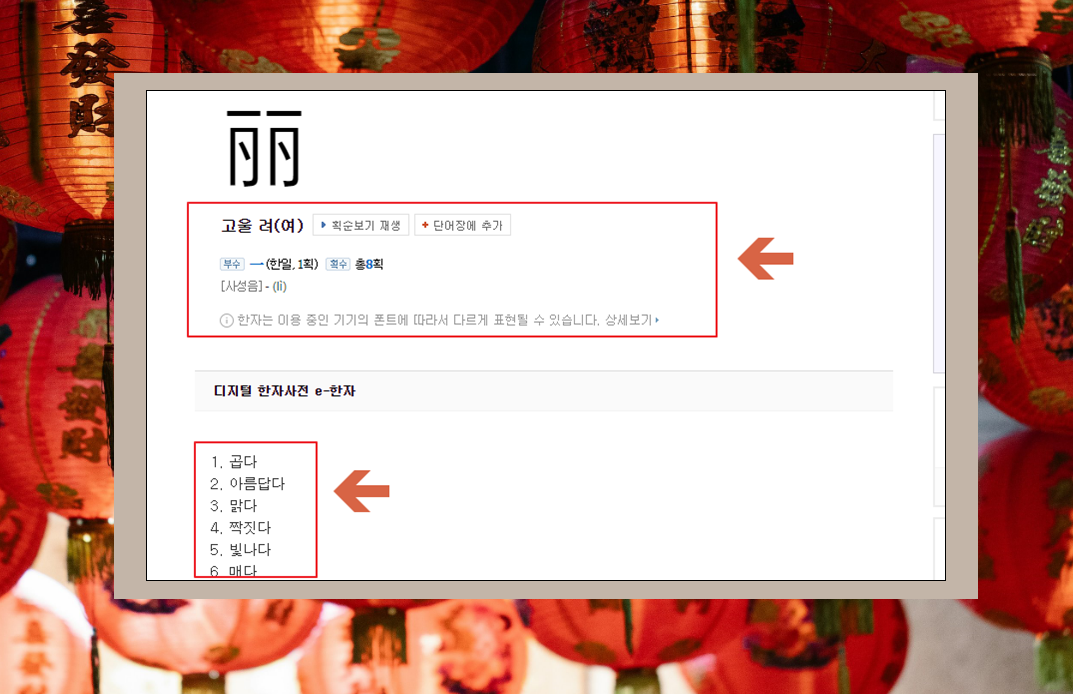 7. 저는 "고울 려"라는 한자를 마우스로 클릭해 보았어요. 이렇게 부수, 획수는 물론이고, 많은 뜻을 읽어볼 수 있어요.