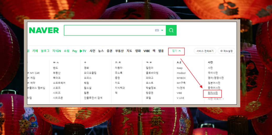 1. 인터넷 옥편 서비스를 여러 가지 사용해본 경험에 의하면 네이버 한문사전의 퀄리티가 매우 뛰어났어요. 해당 사전 서비스를 이용하는 방법은 간단한데요. 네이버 사이트에서 가장 우측에 있는 메뉴("더보기")를 선택해 보세요. 그럼 가나다 순서대로 여러 가지 서비스가 나타나는데요. 가장 우측에 있는 사전 카테고리에서 한자사전을 찾을 수 있어요.