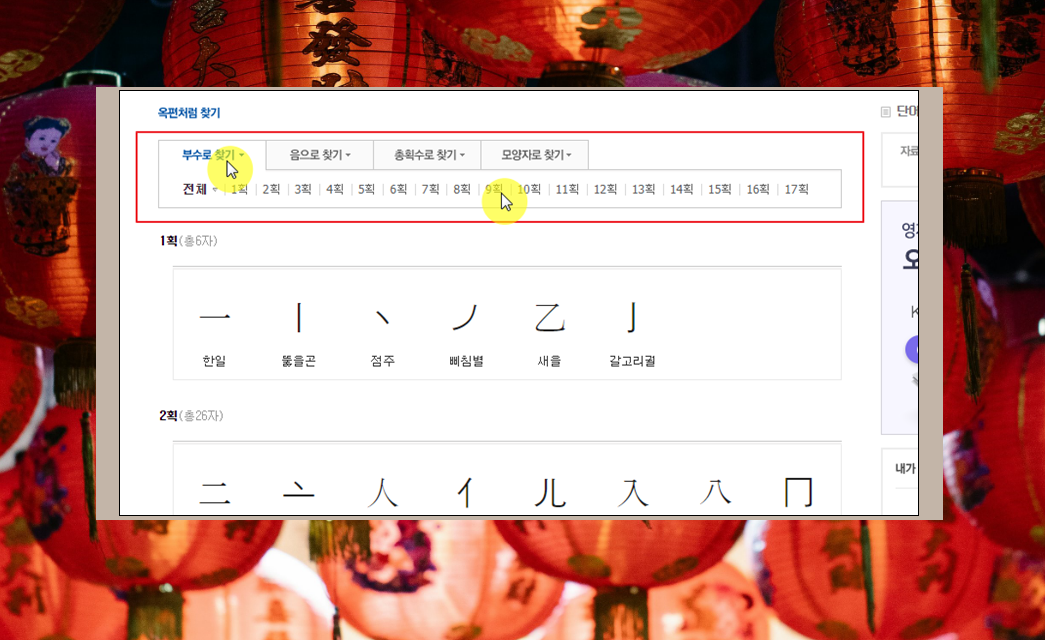 5. 가장 먼저 보이는 것은 부수로 한자찾기 기능이에요. 찾고자 하는 문자의 부수의 획수에 맞는 것을 선택해 주세요. 저는 9획을 선택했는데요. 해당 획에 맞는 문자가 자동으로 나타나요.