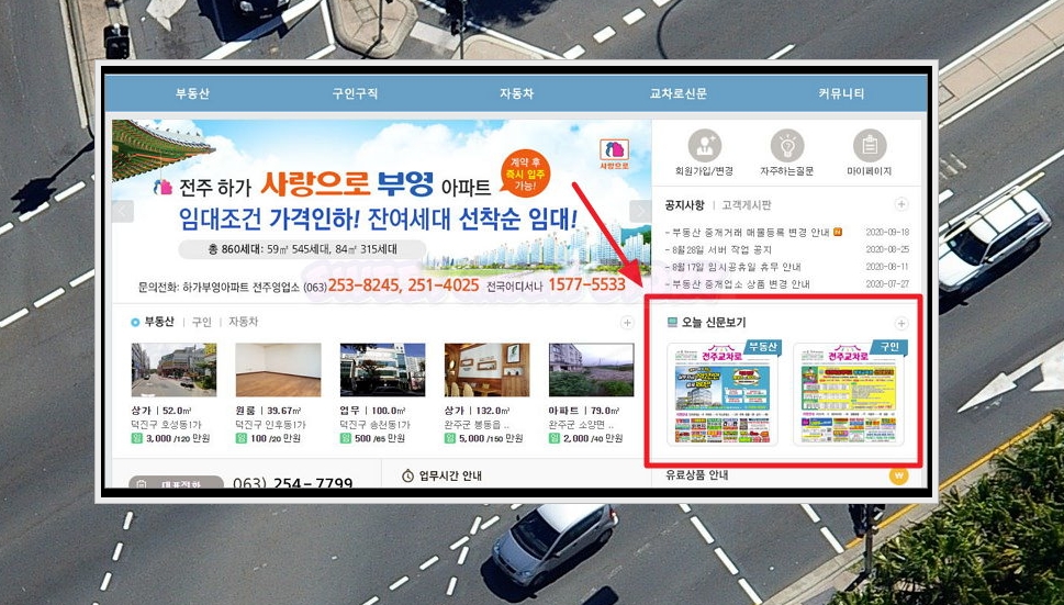 4. 전주 교차로 공식 홈페이지에 접속했어요. 이곳에서는 웹 버전으로 부동산, 구인구직, 자동차, 커뮤니티 서비스를 이용할 수 있는데요. 기존에 교차로를 자주 봐왔던 분이라면 웹 버전이 어색할 수 있어요. 이럴 때에는 홈페이지 우측에 있는 [오늘 신문보기] 옆에 있는 플러스 버튼을 클릭해 주세요.