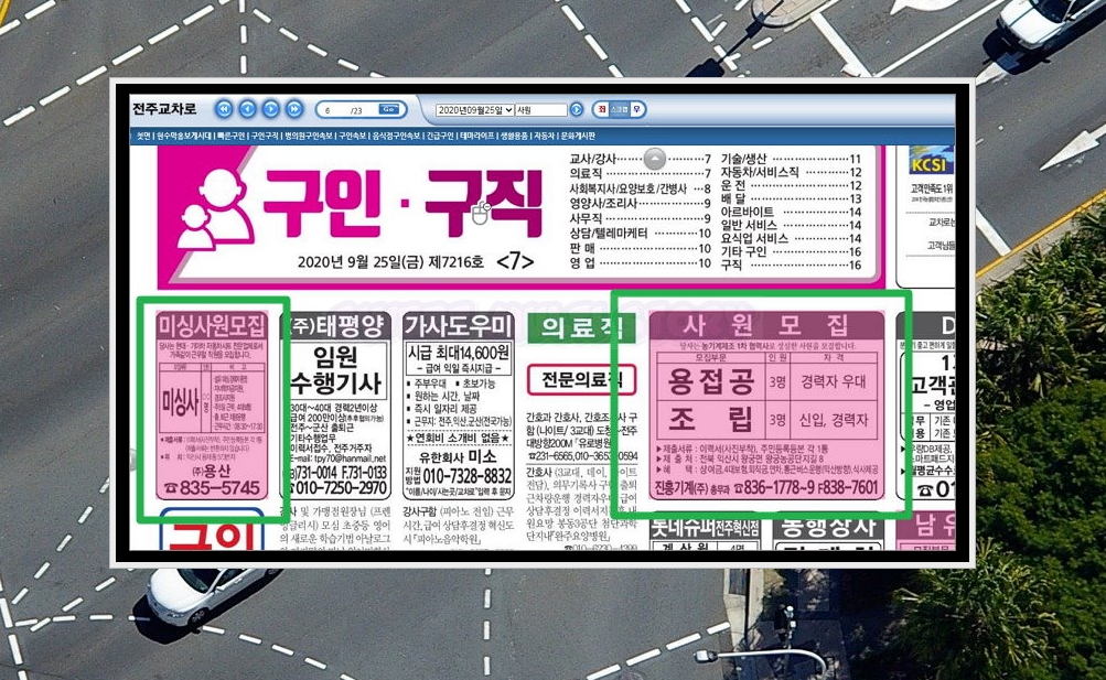 8. 뷰어를 보면 페이지 넘김과 함께 검색 기능이 갖추어져 있어요. 검색 기능을 활용하면 교차로에서 원하는 정보를 쉽고 빠르게 찾을 수 있는데요. 전주 지역에서 사원을 모집하는 내용을 검색해 보았어요. 이렇게 제가 검색한 내용을 포함한 공고는 하이라이트 표시가 되네요. 해당 표시를 통해 쉽게 원하는 정보의 위치를 파악할 수 있어요.