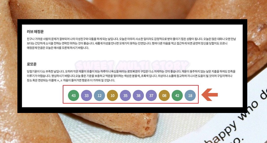 8. 좋아하는 사람이 있거나 애인이 있는 경우라면 애정운을 참고해 보세요. 관계를 좋게 이어갈 수 있도록 도움을 줄 거에요. 거기에 더하여 로또운이 있는데요. 복권을 구매할 때 여기에서 추천하는 번호를 무료로 이용할 수 있어요.