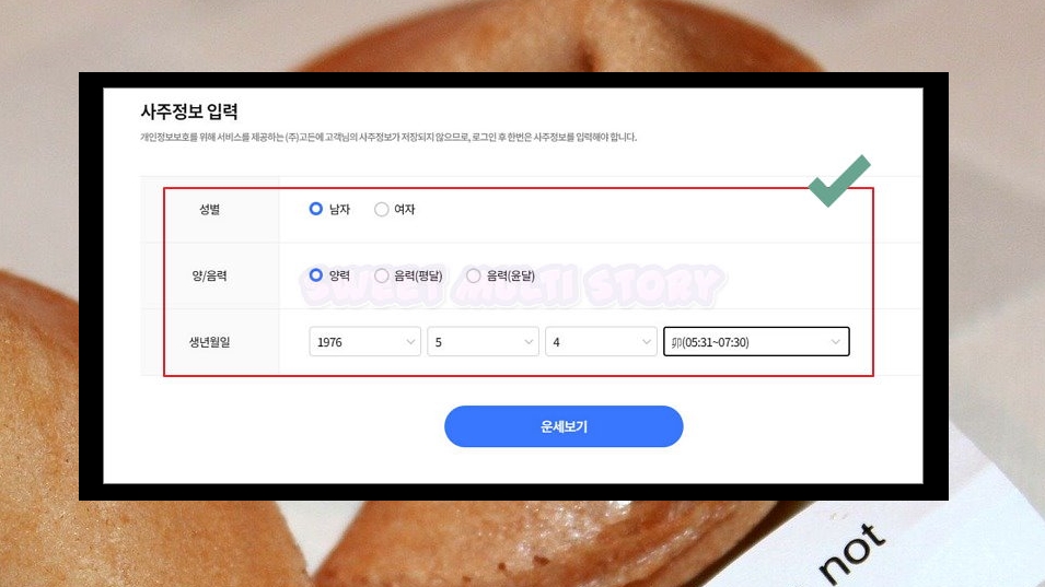 5. 해당 서비스를 이용하려면 사주정보를 입력해야 해요. 다른 오늘의 운세의 경우 태어난 연도 정도만 가지고 운명을 알아봐 주는데요. 여기서는 태어난 월과 일, 시각, 성별까지 입력해야 해요. 그만큼 상세한 풀이를 볼 수 있죠.