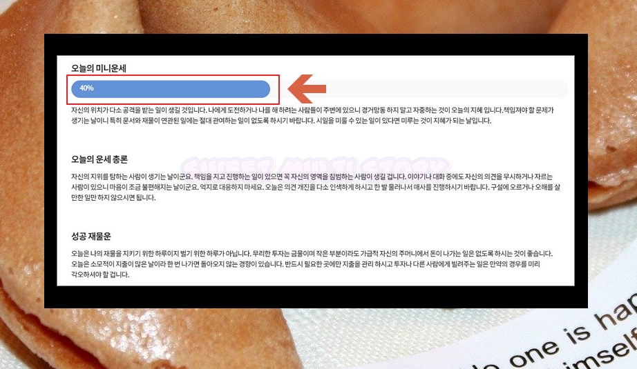 7. 본격적으로 풀이 결과를 살펴볼게요. 모두 무료 조회가 가능한데요. 오늘의 미니 운세를 통해 점수로 된 나의 운을 확인할 수 있어요. 40% 정도면 좋지는 않지만, 나쁘다고도 할 수 없는 수치네요. 그래도 조금은 조심하는 것이 좋을 것 같아요.